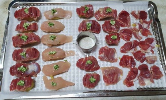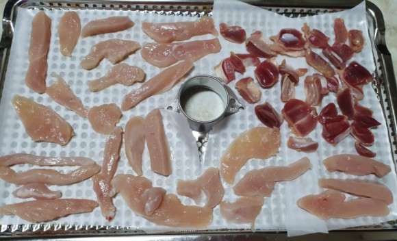 2. 오리 안심, 닭 안심, 오리 근위는 손질 후, 식초 소독을 한다.