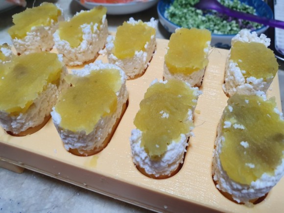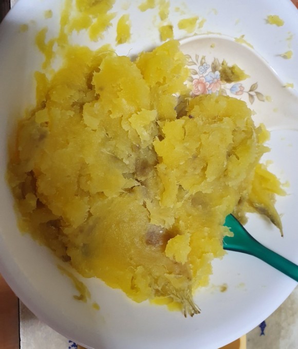 3. 찐 고구마에 수제치즈를 붙여서 밥을 만든다.