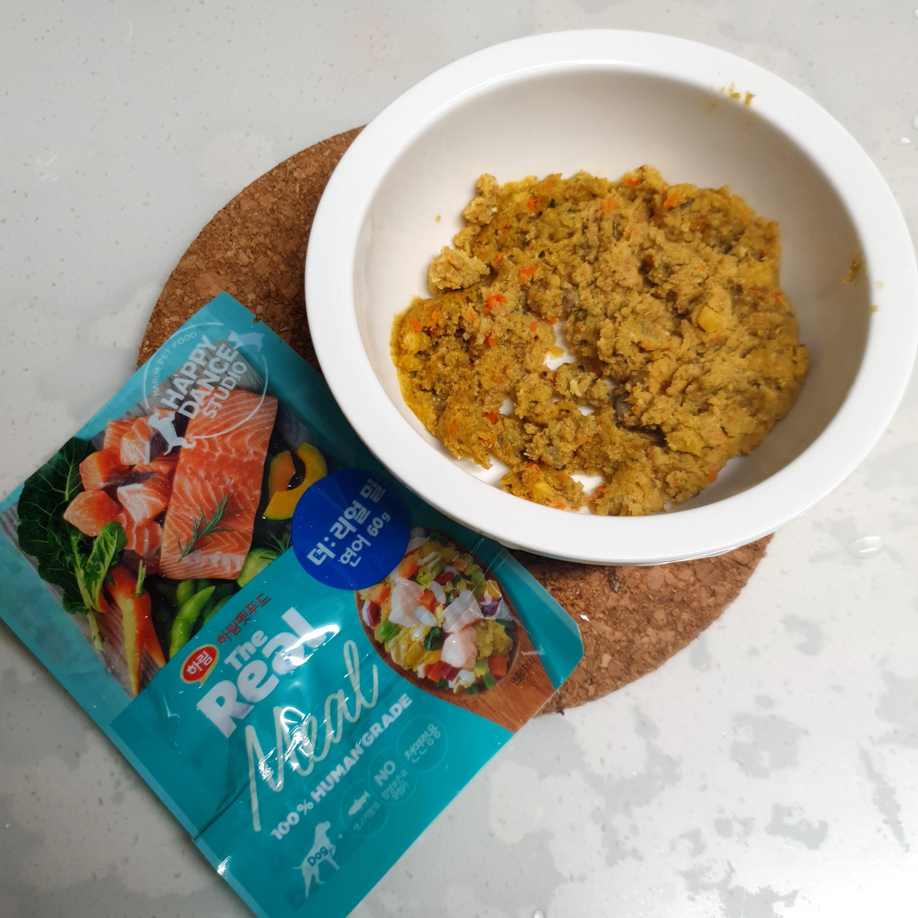 🐕더리얼 밀 연어를 먹었다개!!음수량을 위해서 누나야가 물도 조금 더 넣어서 주었다개!!