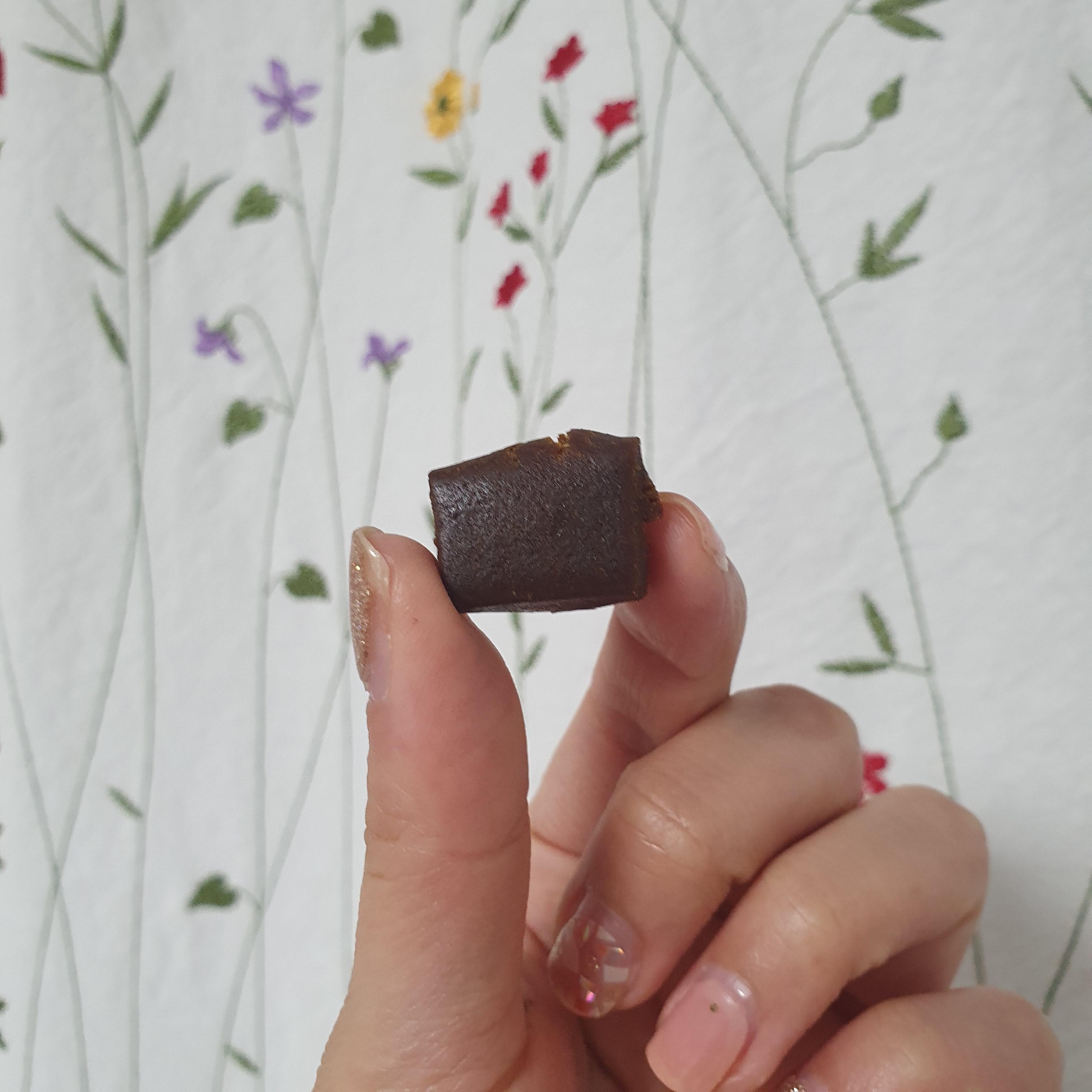 길이 약 2CM 둥글고 연한 갈색의 소프트한 정제