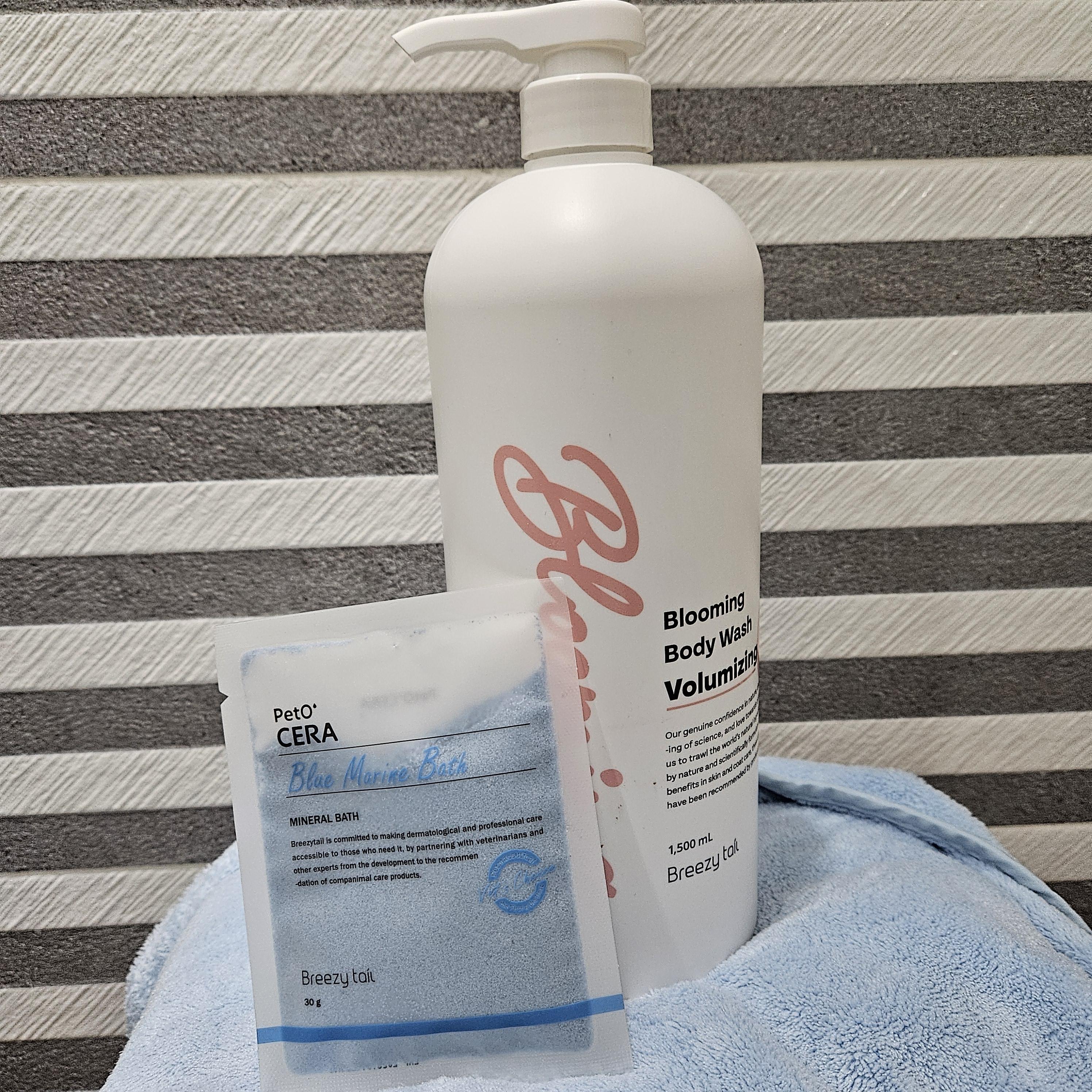[브리지테일]블루밍 볼류마이징 강아지 대용량 저자극 샴푸와 페토세라 블루마린 강아지 고양이 피부 보습스파 입욕제를 사용했다개